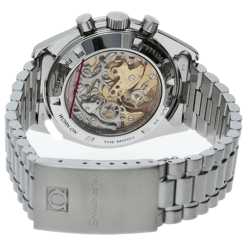 オメガを代表する人気モデルでムーンウォッチとしても有名な1本。シースルーバックから覗ける手巻ムーブメントが特徴的な1本。初期モデルにのみ搭載された金メッキのムーブメントを搭載しております。トリチウム文字盤。Cal.863。