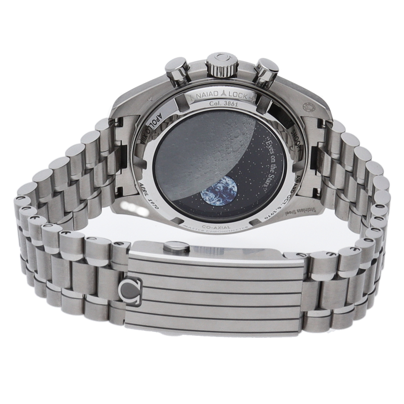 1970年にNASAの宇宙飛行士から贈られた「シルバー スヌーピー アワード」の50周年記念モデルとして作られました。司令機械船に乗ったスヌーピーが、クロノグラフ機能が使用されると回転するマジックハンドにあしらわれています。裏側には地球をかたどったディスクもあり、時計のスモールセコンドに連動して1分間に1回転します。