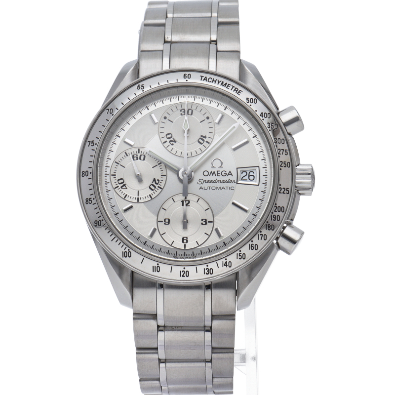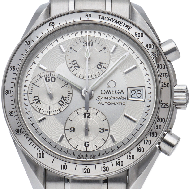 オメガの代表的な人気シリーズ「スピードマスター・デイト」。クロノグラフ・デイト表示機能付きと便利で実用性のある1本です。