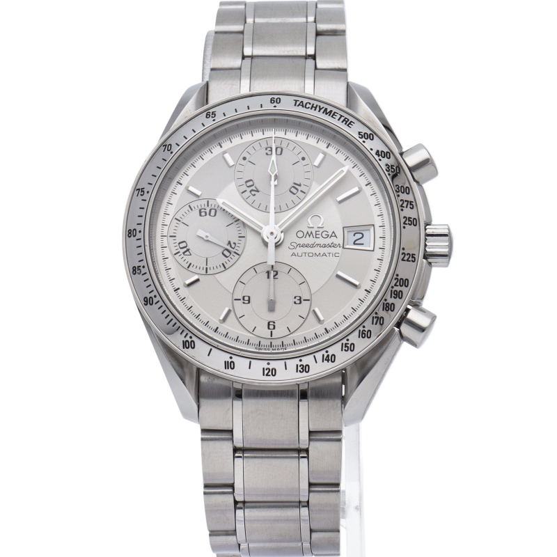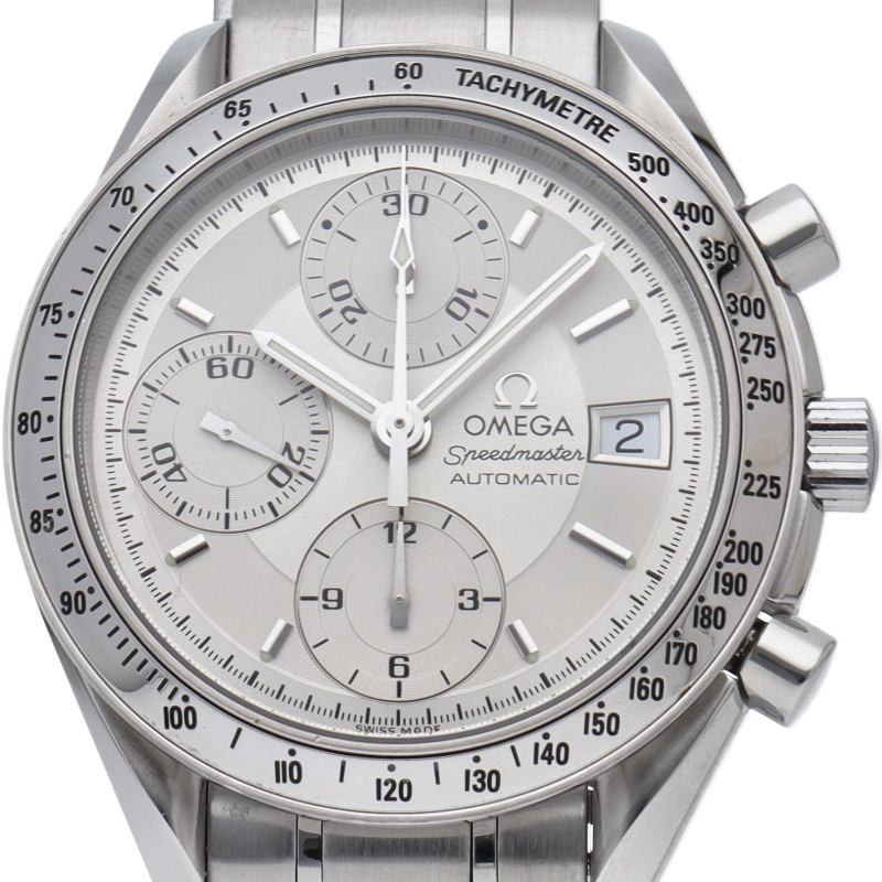 オメガの代表的な人気シリーズ「スピードマスター・デイト」。クロノグラフ・デイト表示機能付きと便利で実用性のある1本です。