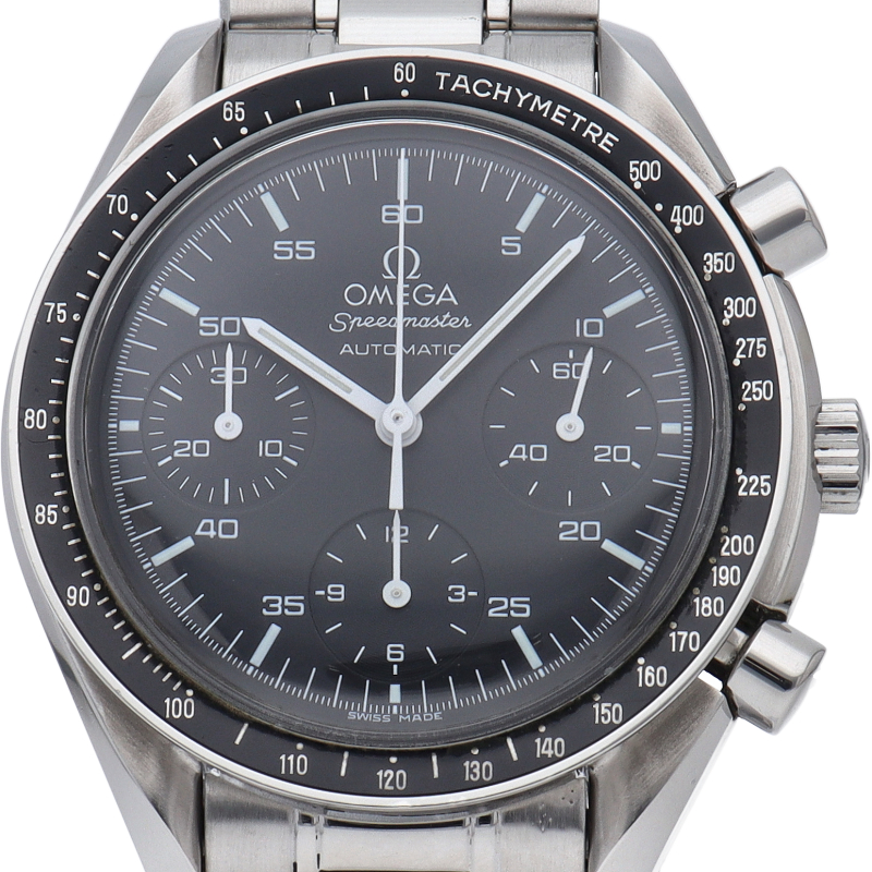 オメガを代表する人気シリーズ「スピードマスター」。プラ風防を使用したレトロな雰囲気かつシンプルにまとまったデザインがスタイルを選ばずにご使用いただけます。