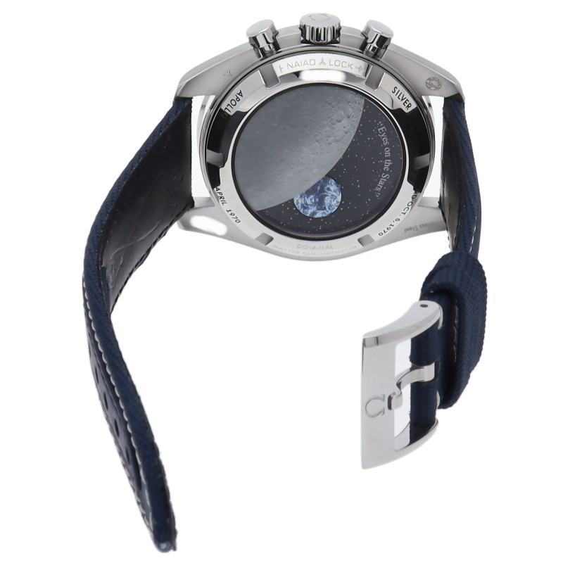 1970年にNASAの宇宙飛行士から贈られた「シルバー スヌーピー アワード」の50周年記念モデルとして作られました。司令機械船に乗ったスヌーピーが、クロノグラフ機能が使用されると回転するマジックハンドにあしらわれています。裏側には地球をかたどったディスクもあり、時計のスモールセコンドに連動して1分間に1回転します。