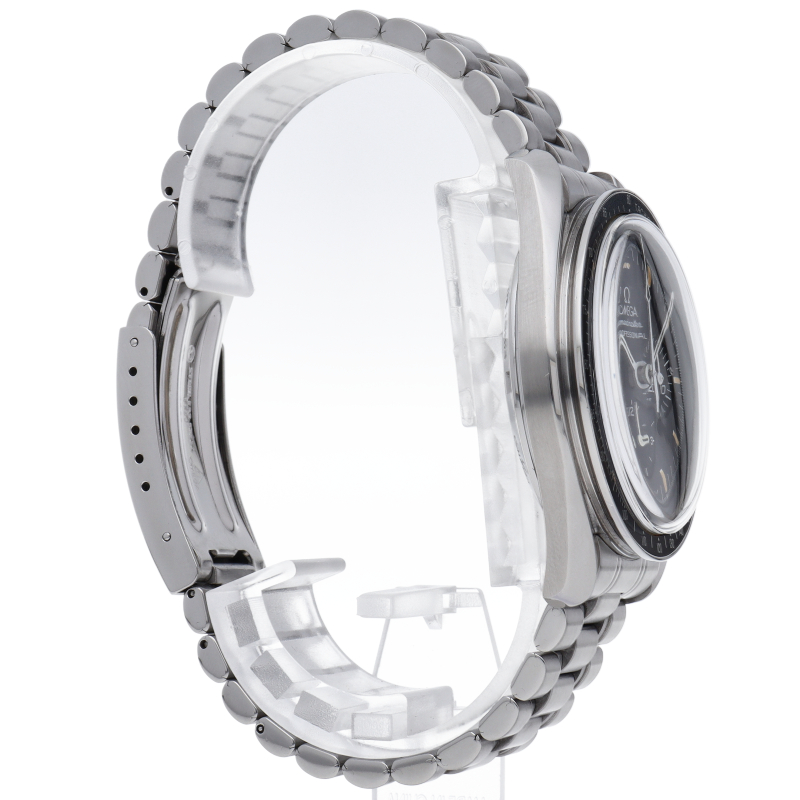 オメガを代表する人気モデルでムーンウォッチとしても有名な1本。シースルーバックから覗ける手巻ムーブメントが特徴的な1本。初期モデルにのみ搭載された金メッキのムーブメントを搭載しております。トリチウム文字盤。Cal.863。
