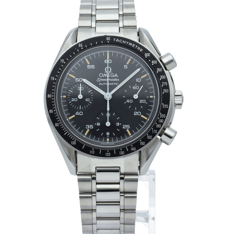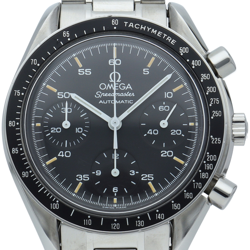 オメガを代表する人気シリーズ「スピードマスター」。プラ風防を使用したレトロな雰囲気かつシンプルにまとまったデザインがスタイルを選ばずにご使用いただけます。