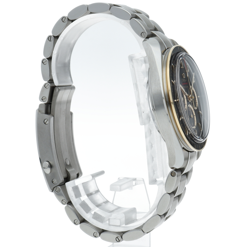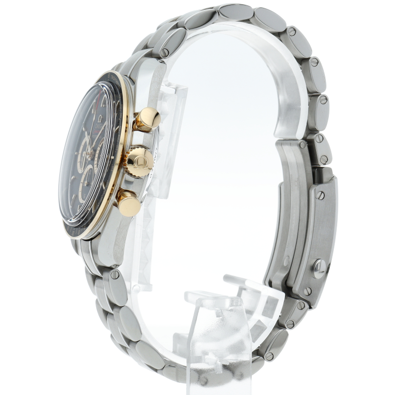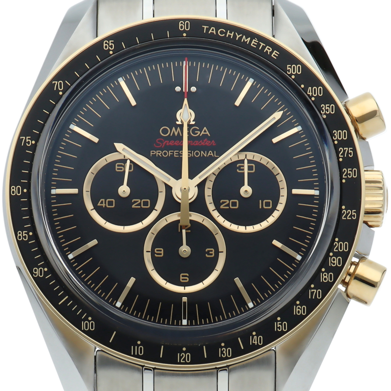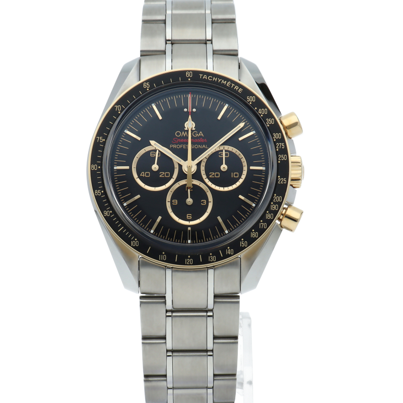 2020年オリンピック 東京大会の開催まで2年を切ったこと祝し、大会のオフィシャルタイムキーパーであるオメガは、2,020本限定の「スピードマスター」を製作しました。18Kイエローゴールドは、オメガのロゴ、針、面取りを施したアプライドインデックス、ブラックのダイアルに配された3つのサブダイアルのリングにも使用されています。ミニッツトラックもイエローゴールドカラーです。