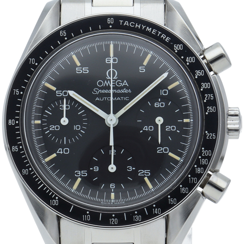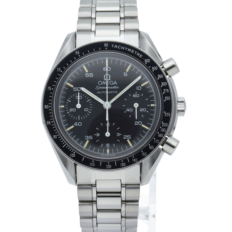 オメガを代表する人気シリーズ「スピードマスター」。プラ風防を使用したレトロな雰囲気かつシンプルにまとまったデザインがスタイルを選ばずにご使用いただけます。