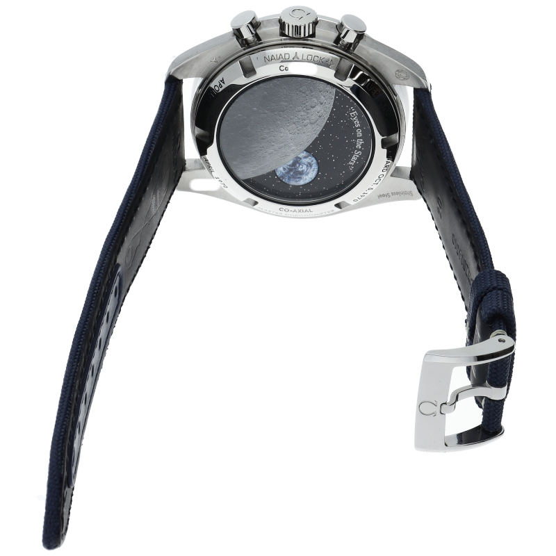 1970年にNASAの宇宙飛行士から贈られた「シルバー スヌーピー アワード」の50周年記念モデルとして作られました。司令機械船に乗ったスヌーピーが、クロノグラフ機能が使用されると回転するマジックハンドにあしらわれています。裏側には地球をかたどったディスクもあり、時計のスモールセコンドに連動して1分間に1回転します。