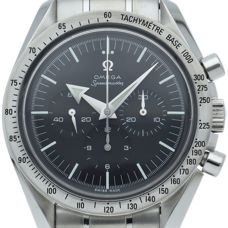 初代スピードマスターの復刻版「ファースト・レプリカ」。アロー針やプラ風防等初代スピードマスターをよく再現したアンティーク風味のある1本。