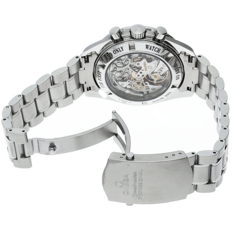 オメガを代表する人気モデルでムーンウォッチとしても有名な1本。シースルーバックから覗ける手巻ムーブメントが特徴的な1本。サファイアガラスに仕様が変更されました。クロノグラフ搭載。Cal.1863。