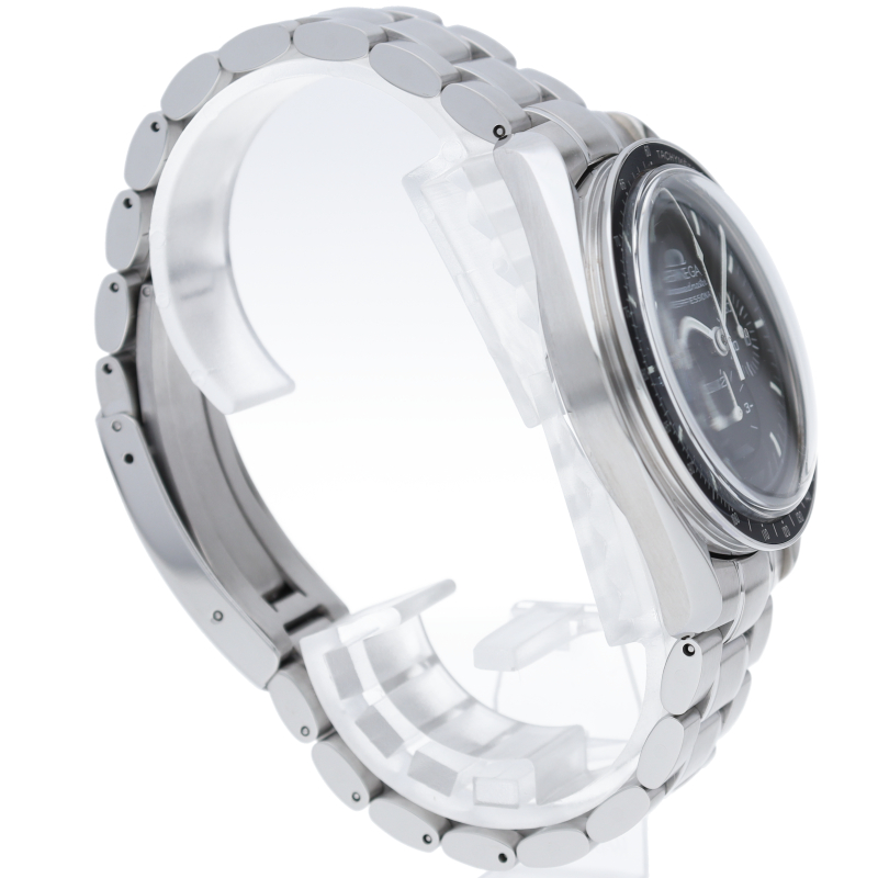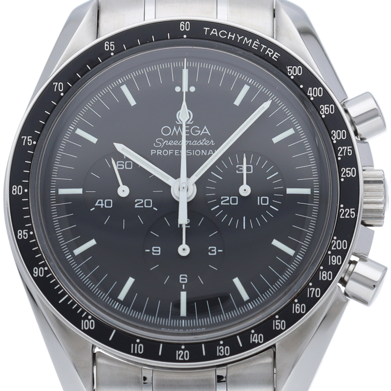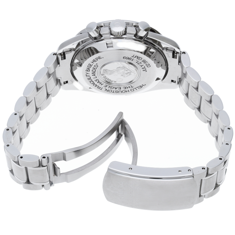 オメガを代表する人気モデルでムーンウォッチとしても有名な1本。こちらは9999本限定のアポロ月面着陸記念モデルです。裏蓋には月面に降り立つイーグルが刻印されています。手巻ムーブメントが逆に新鮮な1本。クロノグラフ機能付。