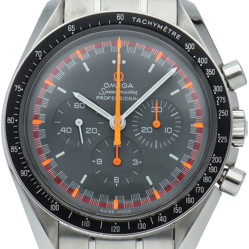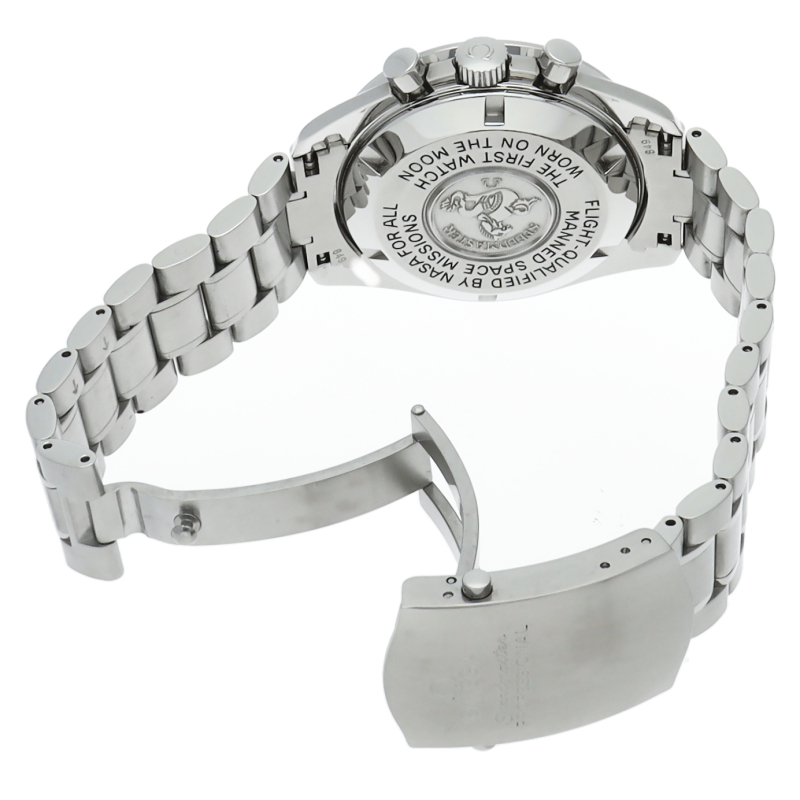 オメガを代表する人気モデルでムーンウォッチとしても有名な1本。プラ風防を使用したレトロな雰囲気と手巻ムーブメントが逆に新鮮な1本。2004年に発売したアポロ11号月面着陸35周年記念限定モデルです。クロノグラフ機能付。