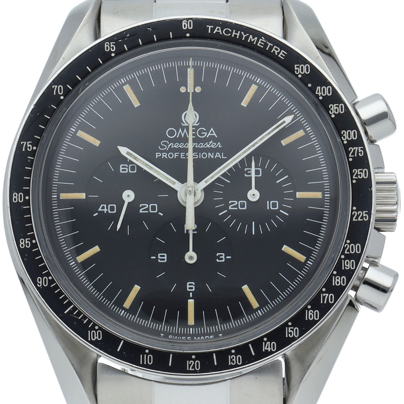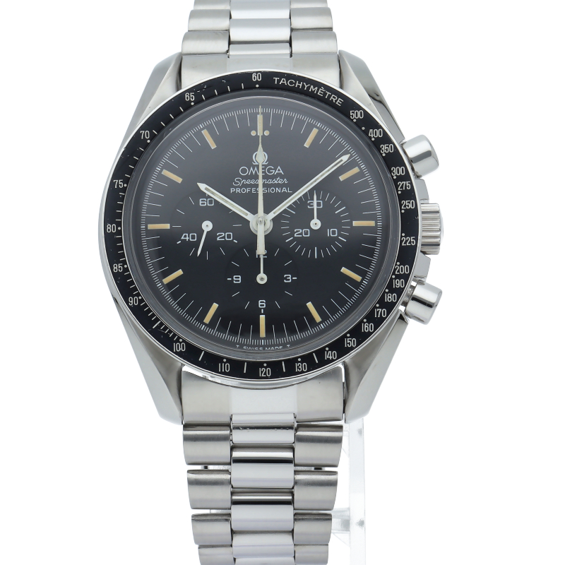 オメガを代表する人気モデルでムーンウォッチとしても有名な1本。シースルーバックから覗ける手巻ムーブメントが特徴的な1本。初期モデルにのみ搭載された金メッキのムーブメントを搭載しております。トリチウム文字盤。Cal.863。