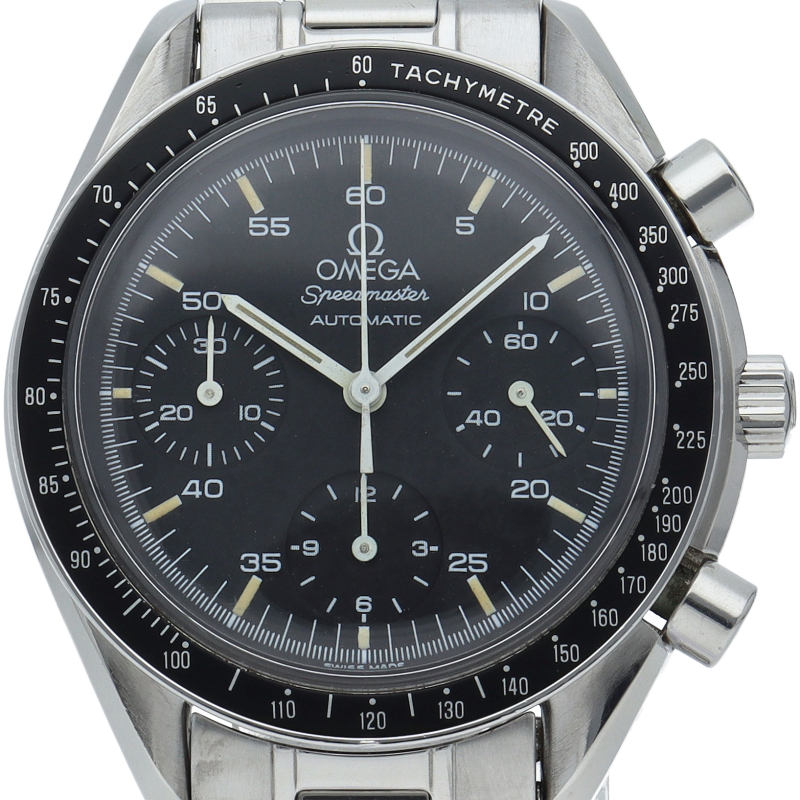 オメガを代表する人気シリーズ「スピードマスター」。プラ風防を使用したレトロな雰囲気かつシンプルにまとまったデザインがスタイルを選ばずにご使用いただけます。