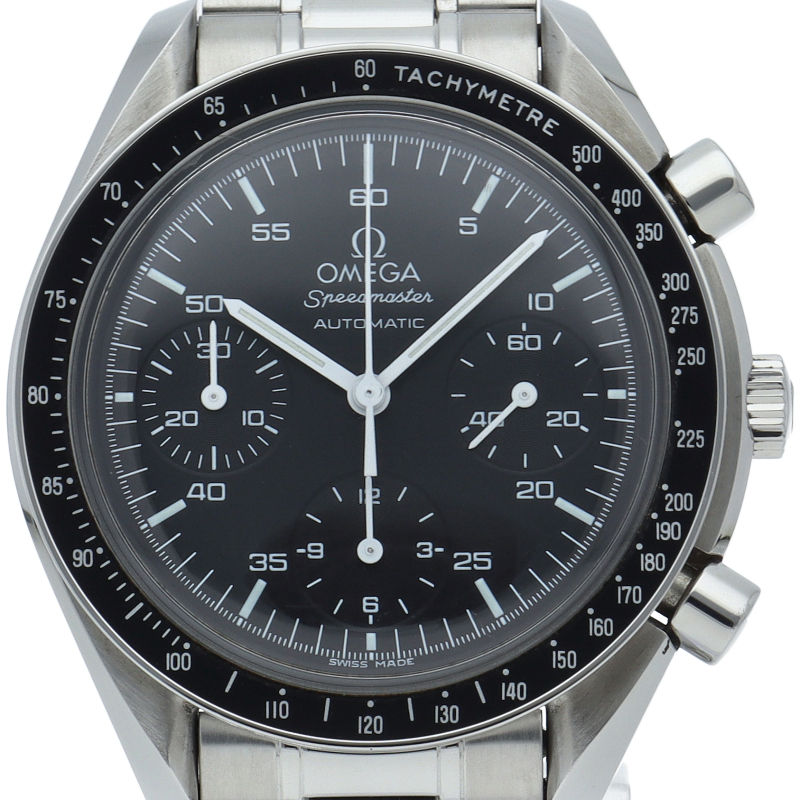 オメガを代表する人気シリーズ「スピードマスター」。プラ風防を使用したレトロな雰囲気かつシンプルにまとまったデザインがスタイルを選ばずにご使用いただけます。