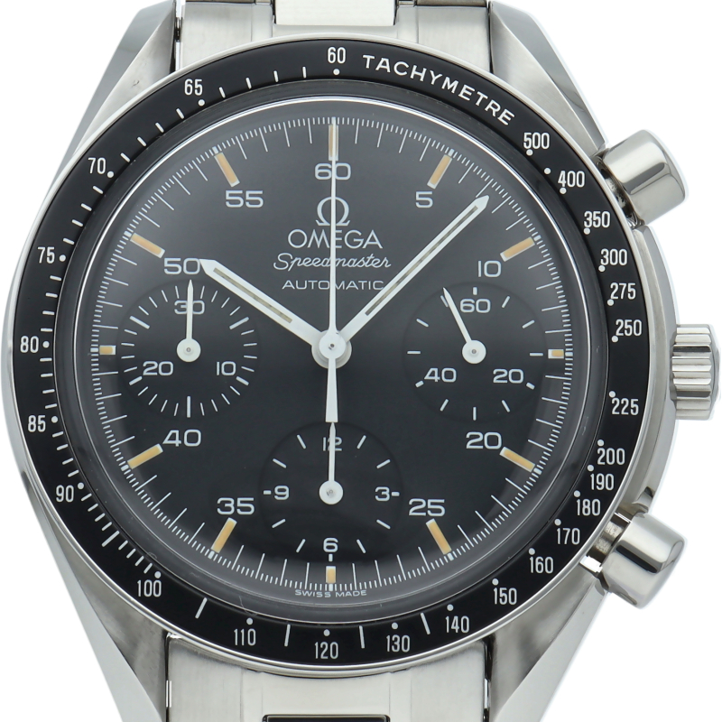 オメガを代表する人気シリーズ「スピードマスター」。プラ風防を使用したレトロな雰囲気かつシンプルにまとまったデザインがスタイルを選ばずにご使用いただけます。