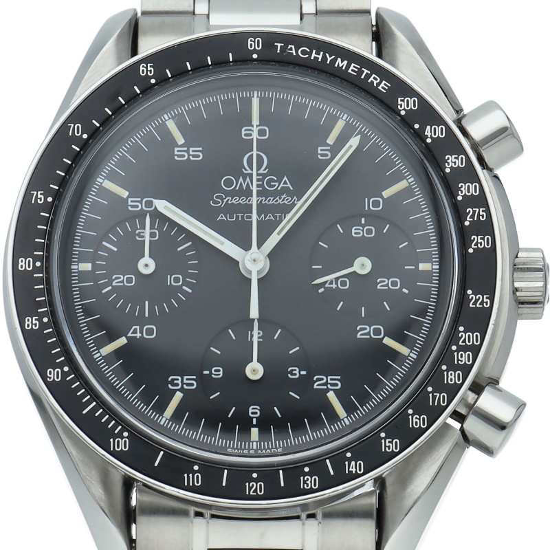 オメガを代表する人気シリーズ「スピードマスター」。プラ風防を使用したレトロな雰囲気かつシンプルにまとまったデザインがスタイルを選ばずにご使用いただけます。