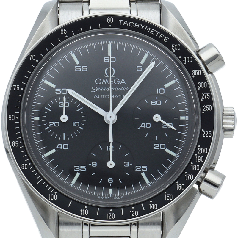 オメガを代表する人気シリーズ「スピードマスター」。プラ風防を使用したレトロな雰囲気かつシンプルにまとまったデザインがスタイルを選ばずにご使用いただけます。
