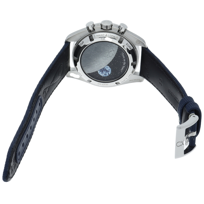1970年にNASAの宇宙飛行士から贈られた「シルバー スヌーピー アワード」の50周年記念モデルとして作られました。司令機械船に乗ったスヌーピーが、クロノグラフ機能が使用されると回転するマジックハンドにあしらわれています。裏側には地球をかたどったディスクもあり、時計のスモールセコンドに連動して1分間に1回転します。