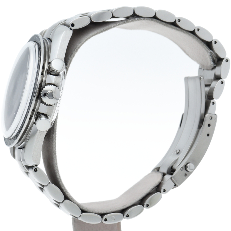 オメガを代表する人気モデルでムーンウォッチとしても有名な1本。プラ風防を使用したレトロな雰囲気とシースルーバックから覗ける手巻ムーブメントが特徴的な1本。クロノグラフ搭載。Cal.1863。