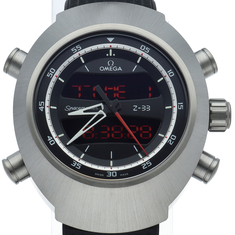 「スペースマスター Z-33」は、歴代「スピードマスター」の中でも人気を博したパイロットラインと呼ばれる特徴的な形状のケースに、最新の多機能クォーツムーブメント、キャリバー5666を搭載しています。また、ケース両サイドにある4つのプッシャーをリュウズと共に使うと、さまざまなデジタル機能をすべてコントロールすることができます。