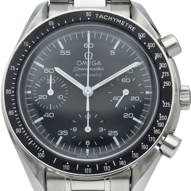 オメガを代表する人気シリーズ「スピードマスター」。プラ風防を使用したレトロな雰囲気かつシンプルにまとまったデザインがスタイルを選ばずにご使用いただけます。