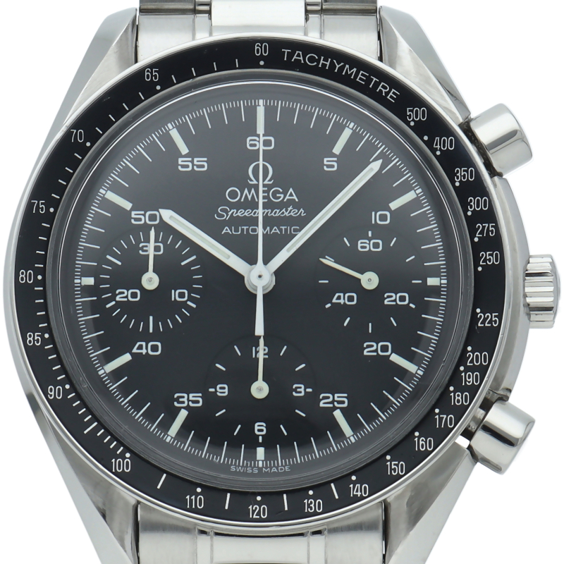オメガを代表する人気シリーズ「スピードマスター」。プラ風防を使用したレトロな雰囲気かつシンプルにまとまったデザインがスタイルを選ばずにご使用いただけます。