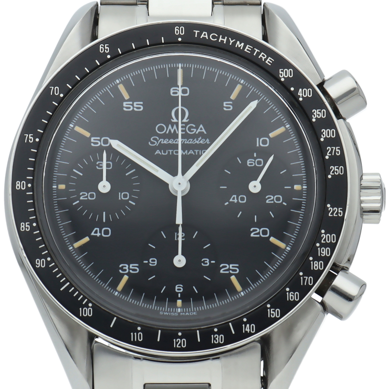オメガを代表する人気シリーズ「スピードマスター」。プラ風防を使用したレトロな雰囲気かつシンプルにまとまったデザインがスタイルを選ばずにご使用いただけます。