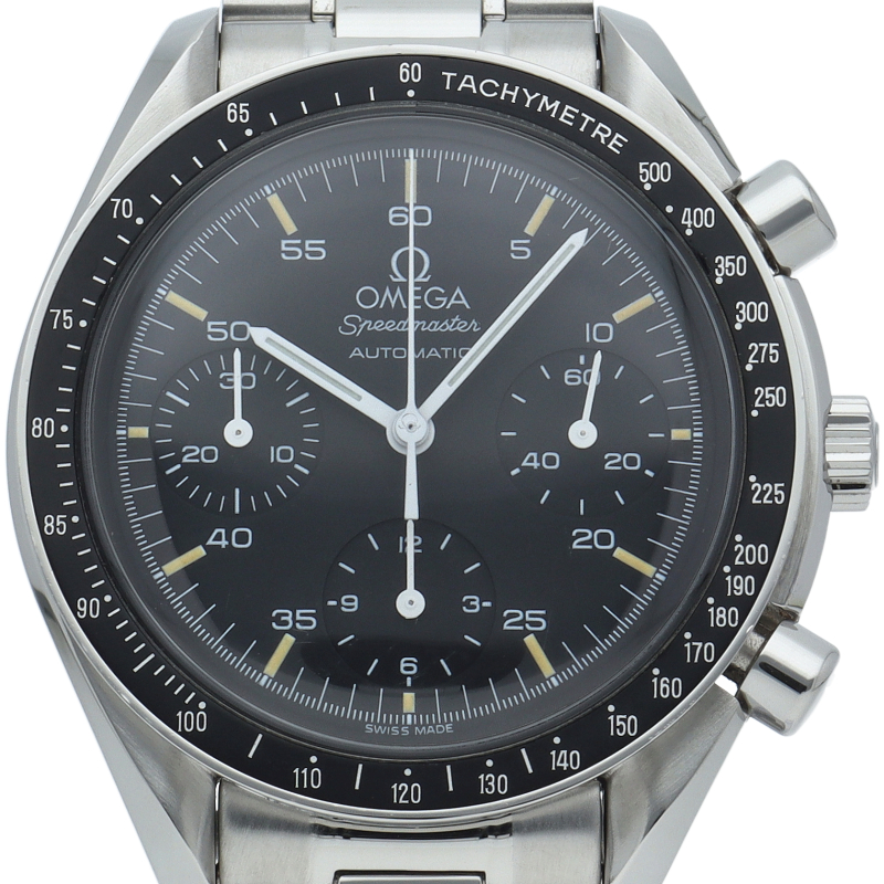 オメガを代表する人気シリーズ「スピードマスター」。プラ風防を使用したレトロな雰囲気かつシンプルにまとまったデザインがスタイルを選ばずにご使用いただけます。