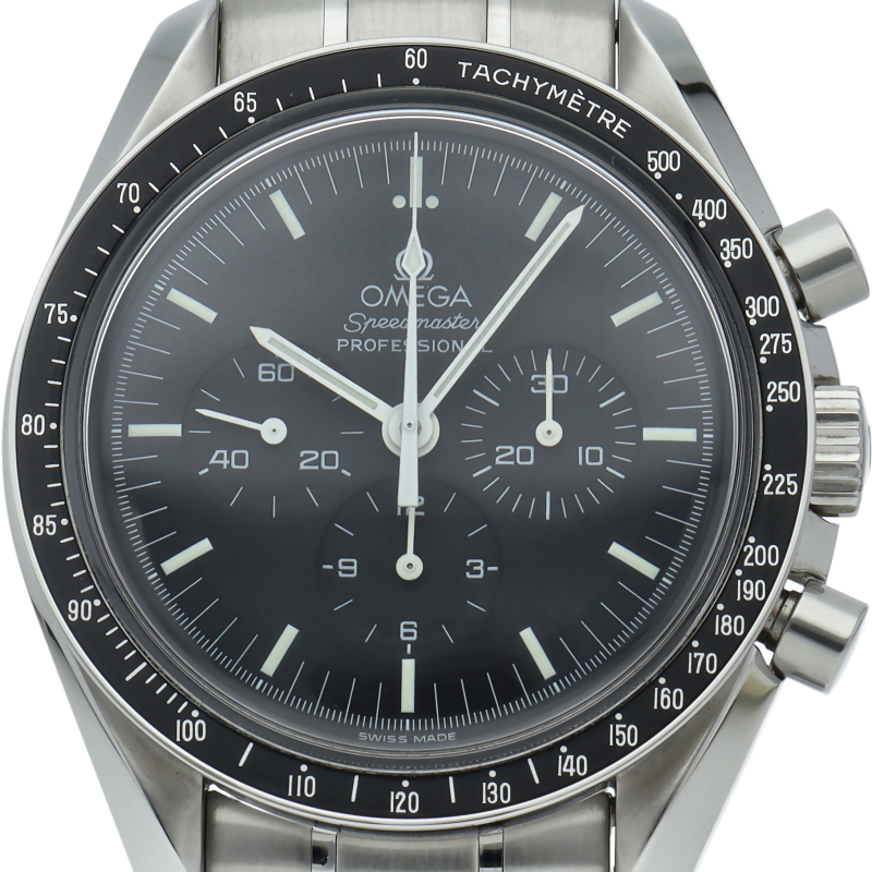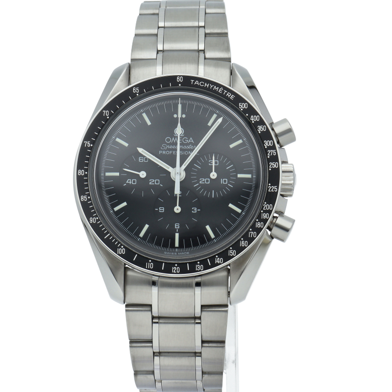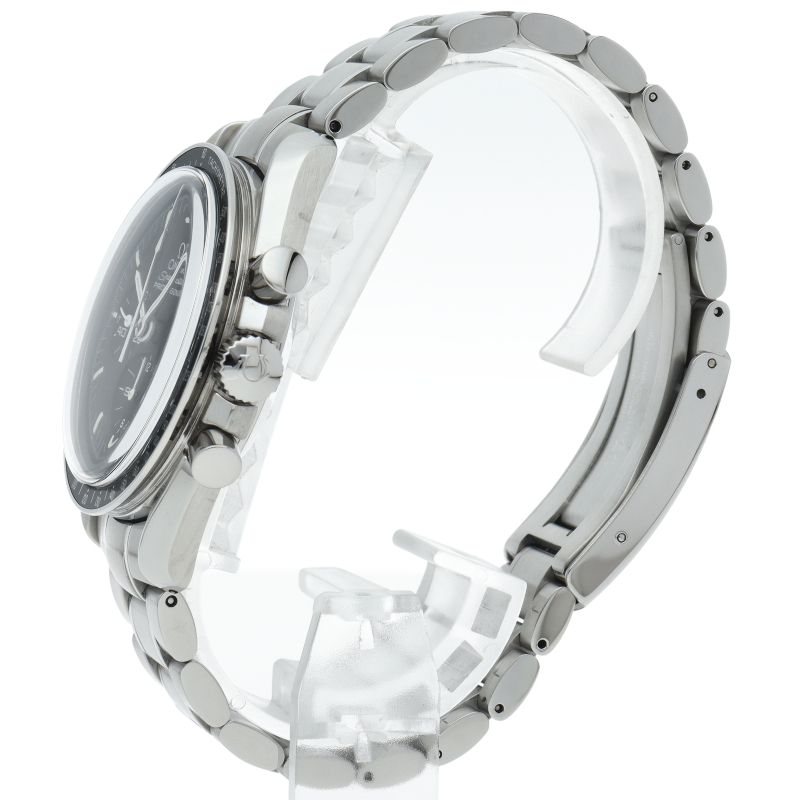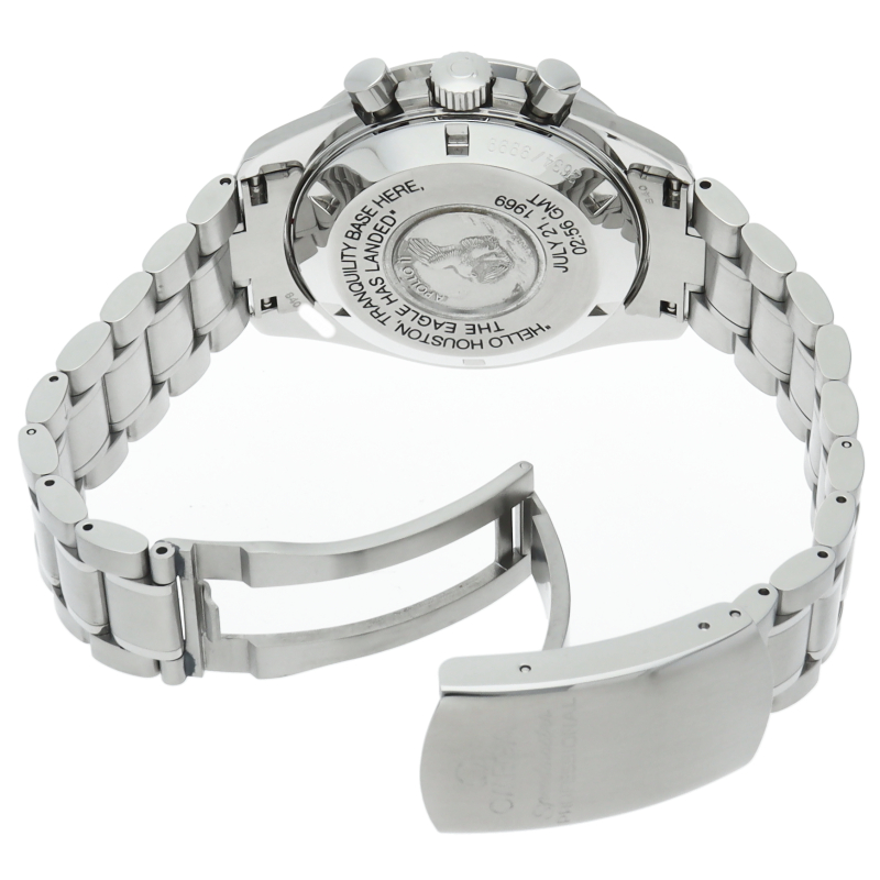 オメガを代表する人気モデルでムーンウォッチとしても有名な1本。こちらは9999本限定のアポロ月面着陸記念モデルです。裏蓋には月面に降り立つイーグルが刻印されています。手巻ムーブメントが逆に新鮮な1本。クロノグラフ機能付。