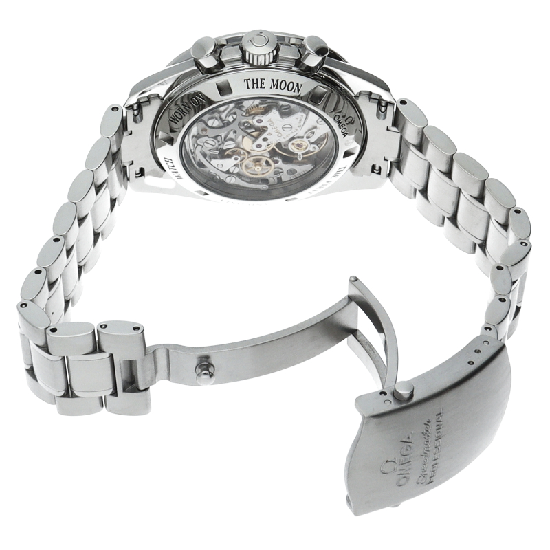 オメガを代表する人気モデルでムーンウォッチとしても有名な1本。シースルーバックから覗ける手巻ムーブメントが特徴的な1本。サファイアガラスに仕様が変更されました。クロノグラフ搭載。Cal.1863。