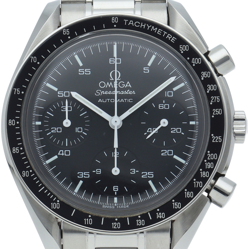 オメガを代表する人気シリーズ「スピードマスター」。プラ風防を使用したレトロな雰囲気かつシンプルにまとまったデザインがスタイルを選ばずにご使用いただけます。