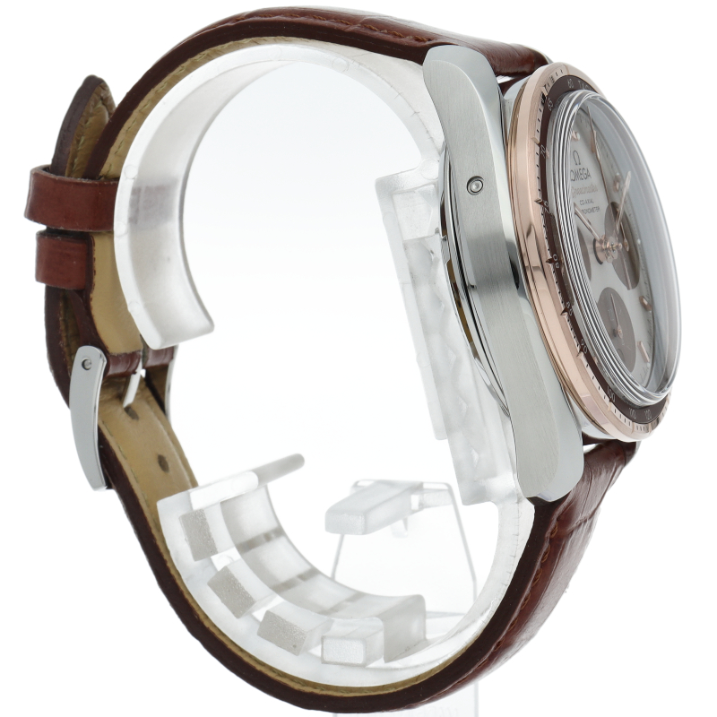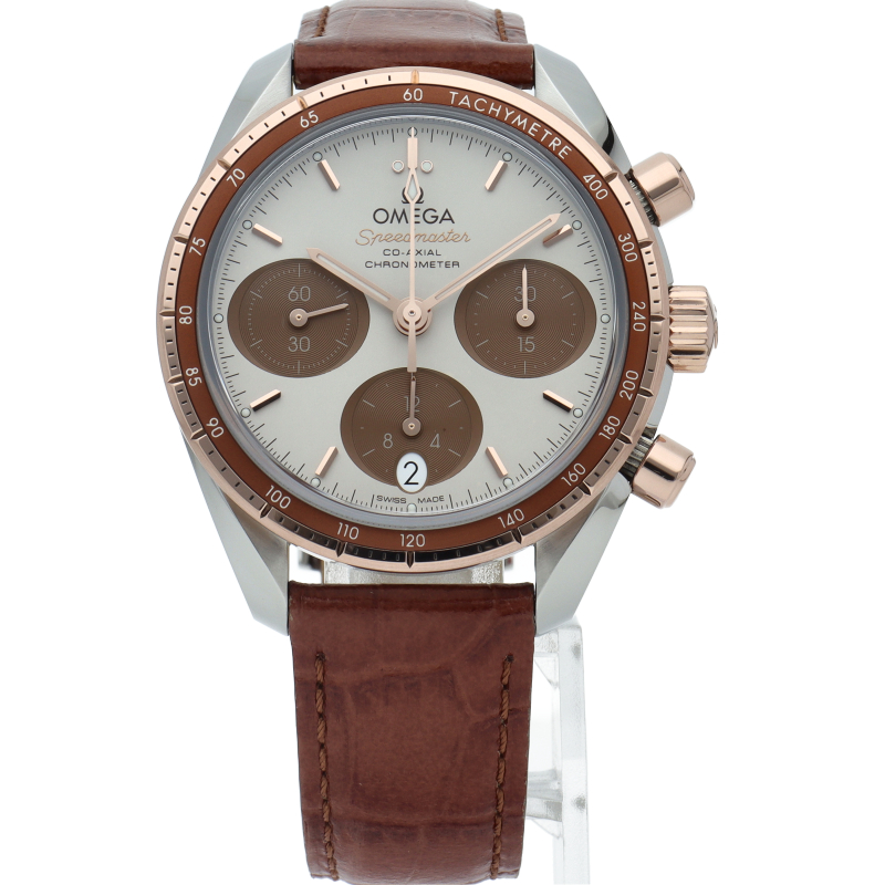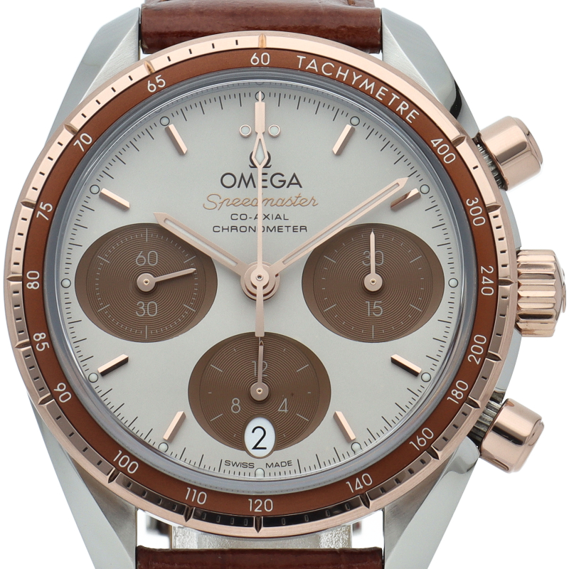スピードマスター 38mmは、シンプルさ、サイズ感、カラーを大切にして生まれたモデル。最も有名なクロノグラフとしてのルックスと伝統もしっかりと守られています。「カプチーノ」ダイアルには横楕円型のサブダイアルを、6時位置には縦楕円型の日付窓を配しました。インデックスと針は18Kセドナゴールド製で、時針、分針、クロノグラフ秒針にはホワイトのスーパールミノヴァが塗布されています。