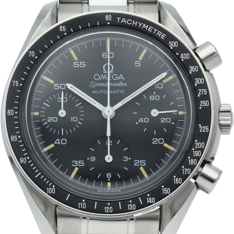 オメガを代表する人気シリーズ「スピードマスター」。プラ風防を使用したレトロな雰囲気かつシンプルにまとまったデザインがスタイルを選ばずにご使用いただけます。