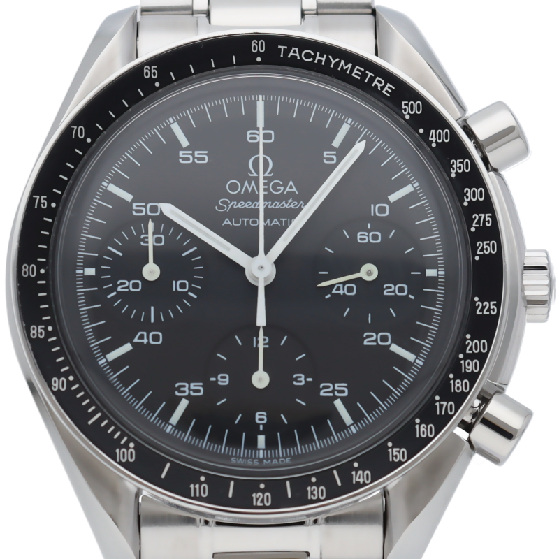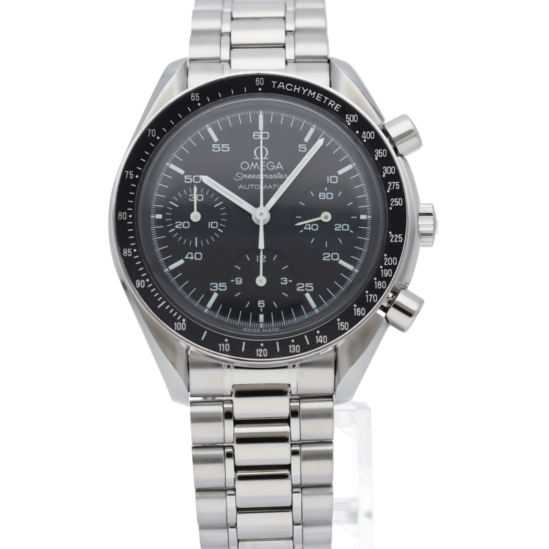 オメガを代表する人気シリーズ「スピードマスター」。プラ風防を使用したレトロな雰囲気かつシンプルにまとまったデザインがスタイルを選ばずにご使用いただけます。