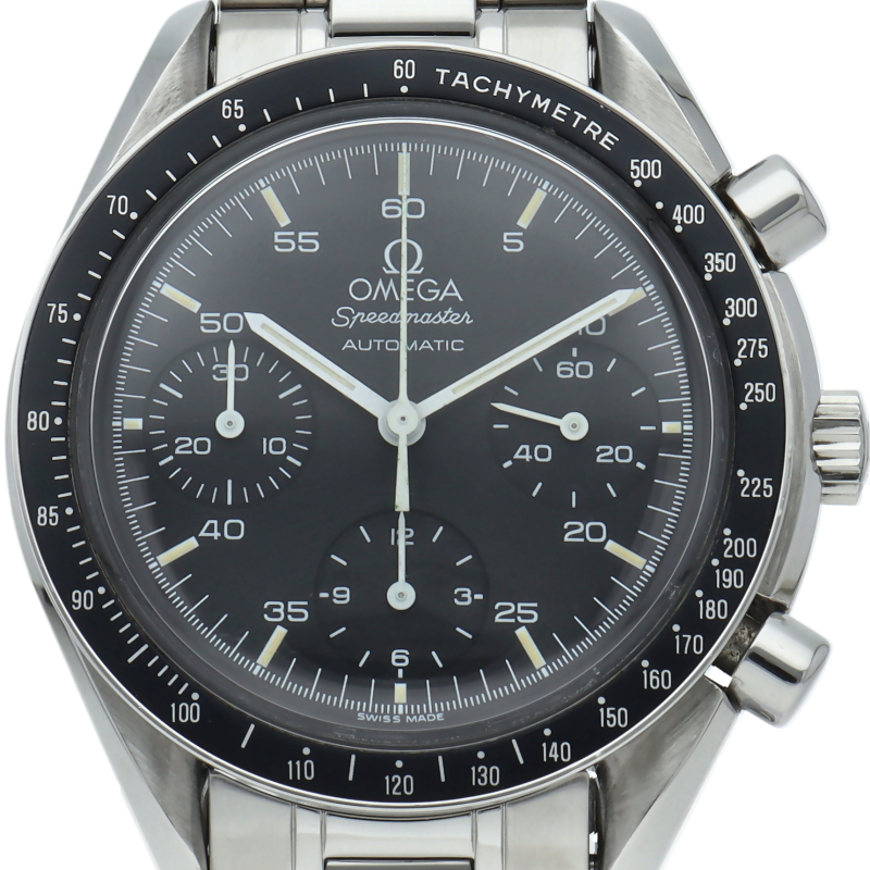 オメガを代表する人気シリーズ「スピードマスター」。プラ風防を使用したレトロな雰囲気かつシンプルにまとまったデザインがスタイルを選ばずにご使用いただけます。