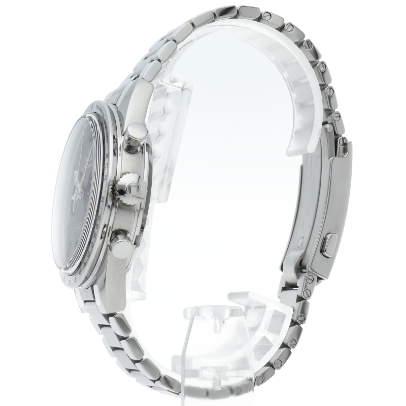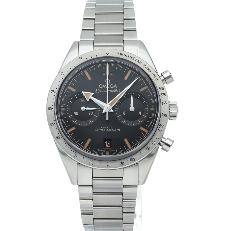 伝説的な1957年の初代スピードマスターにインスピレーションを受けたこのモデルは、ステンレススティール製ケースとブラックのダイアル、ヴィンテージ スーパールミノヴァが塗布された凹型のインデックスを備えています。ロジウム仕上げの「ブロードアロー」針、6時位置に日付表示、9時位置にスモールセコンド、3時位置には12時間と60分の同軸積算計のサブダイアルが配置されています。