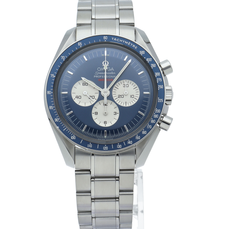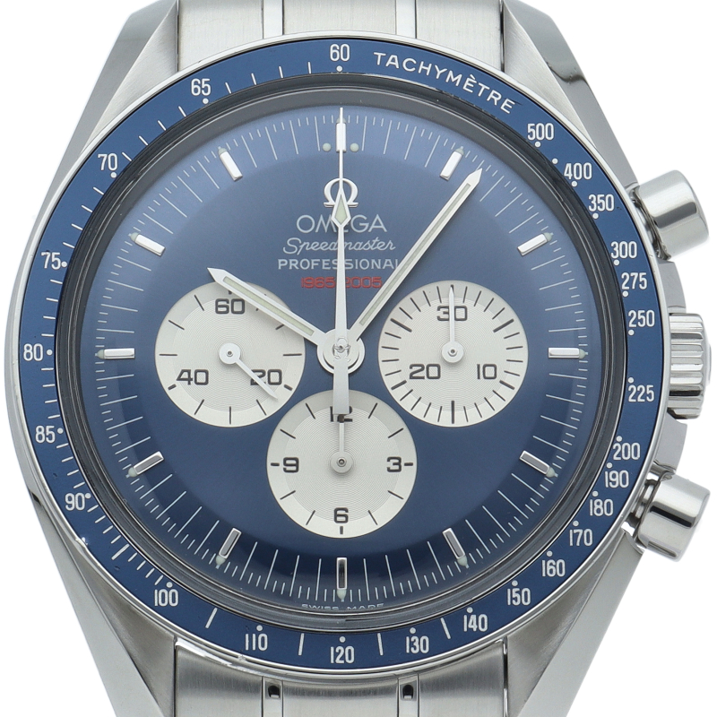 オメガ「スピードマスター プロフェッショナル」(3565.80)。ジェミニ4号の宇宙遊泳40周年を記念した、世界限定2005本の希少モデルです。鮮やかなブルー文字盤にシルバーのインダイヤルが映える特別仕様。裏蓋には記念パッチの赤い刻印が施され、宇宙へのロマンと特別感を堪能できる手巻きクロノグラフです。