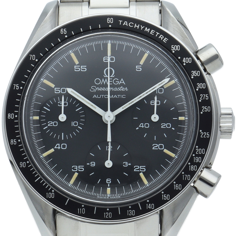 オメガを代表する人気シリーズ「スピードマスター」。プラ風防を使用したレトロな雰囲気かつシンプルにまとまったデザインがスタイルを選ばずにご使用いただけます。