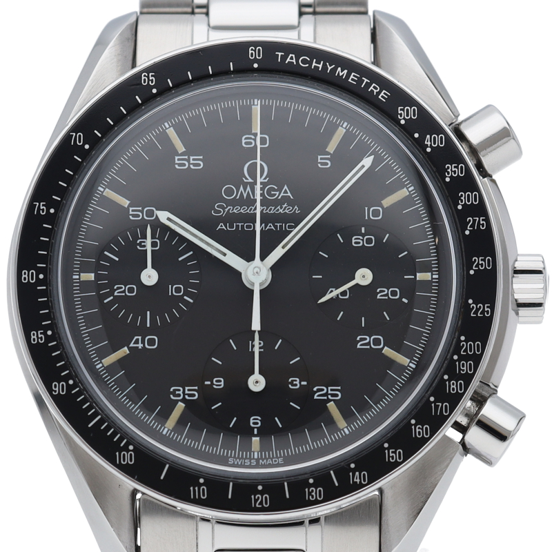 オメガを代表する人気シリーズ「スピードマスター」。プラ風防を使用したレトロな雰囲気かつシンプルにまとまったデザインがスタイルを選ばずにご使用いただけます。