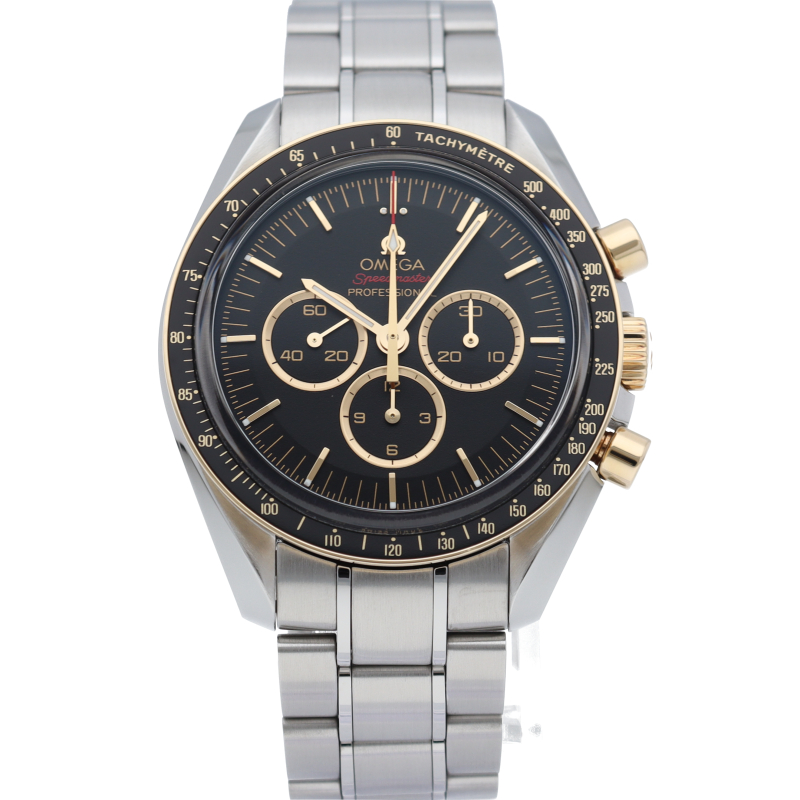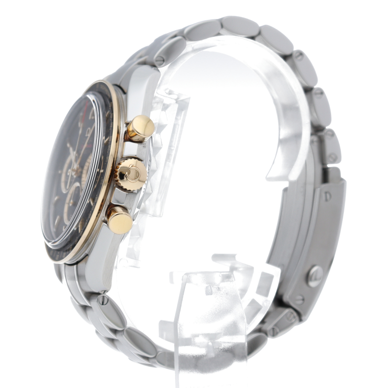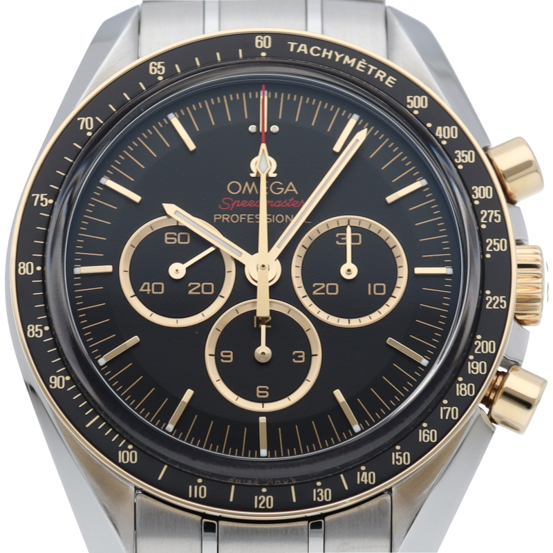 2020年オリンピック 東京大会の開催まで2年を切ったこと祝し、大会のオフィシャルタイムキーパーであるオメガは、2,020本限定の「スピードマスター」を製作しました。18Kイエローゴールドは、オメガのロゴ、針、面取りを施したアプライドインデックス、ブラックのダイアルに配された3つのサブダイアルのリングにも使用されています。ミニッツトラックもイエローゴールドカラーです。