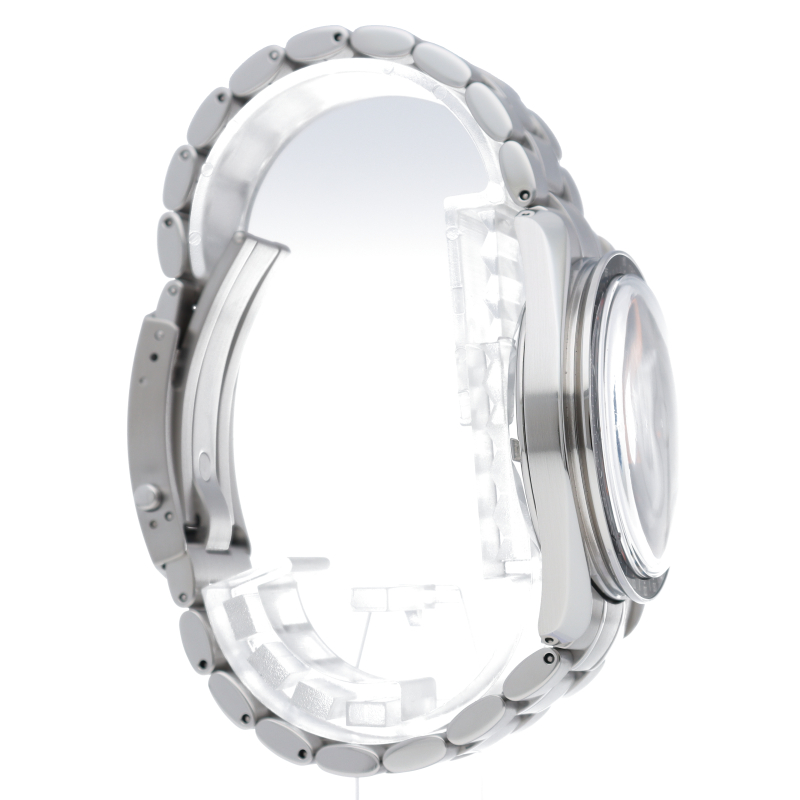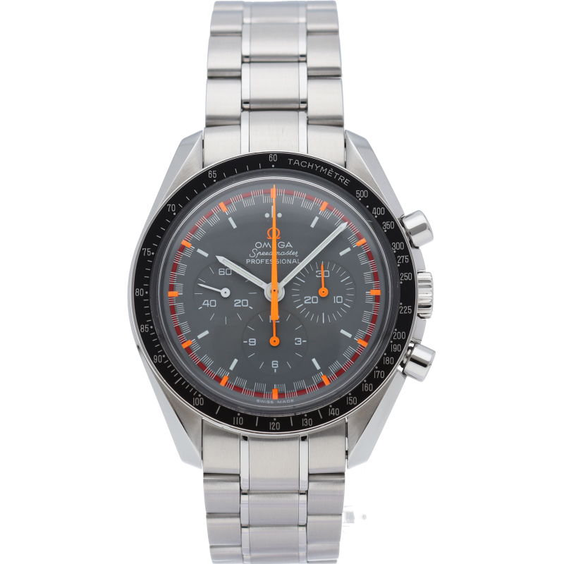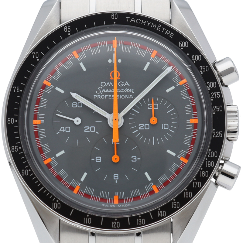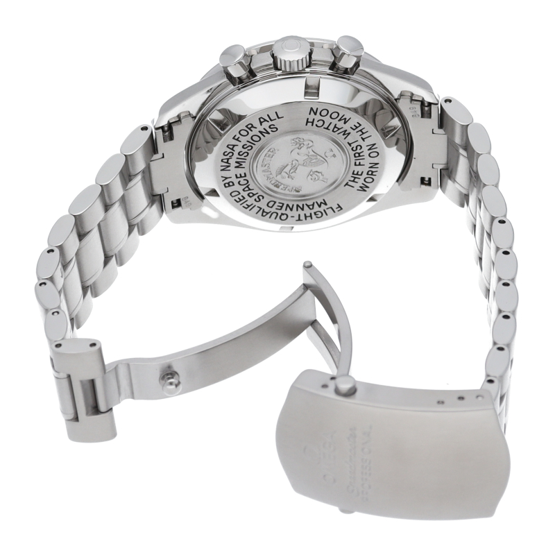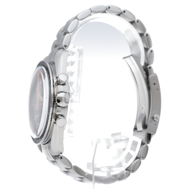 オメガを代表する人気モデルでムーンウォッチとしても有名な1本。プラ風防を使用したレトロな雰囲気と手巻ムーブメントが逆に新鮮な1本。2004年に発売したアポロ11号月面着陸35周年記念限定モデルです。クロノグラフ機能付。