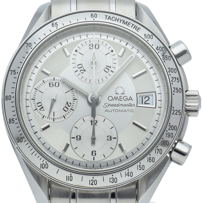 オメガの代表的な人気シリーズ「スピードマスター・デイト」。クロノグラフ・デイト表示機能付きと便利で実用性のある1本です。