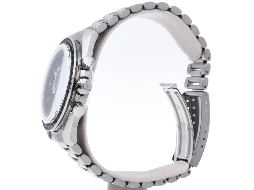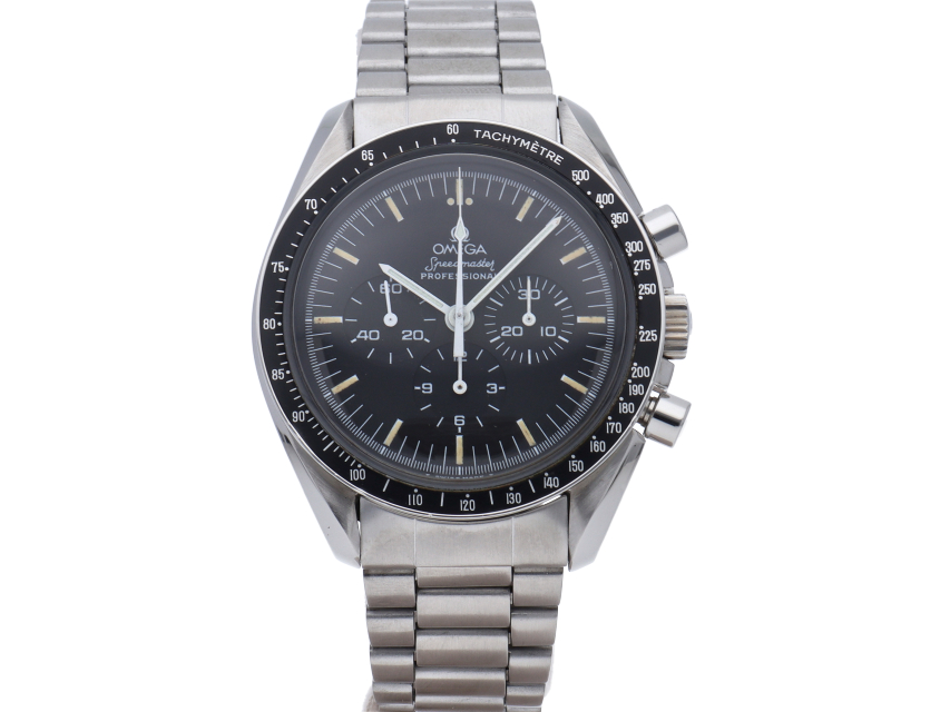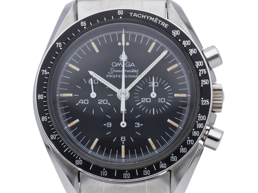 オメガを代表する人気モデルでムーンウォッチとしても有名な1本。プラ風防を使用したレトロな雰囲気と手巻ムーブメントが逆に新鮮な1本。クロノグラフ機能付。文字盤のスピードマスターの表記が下がりR仕様です。Cal.861の金メッキが搭載しています。