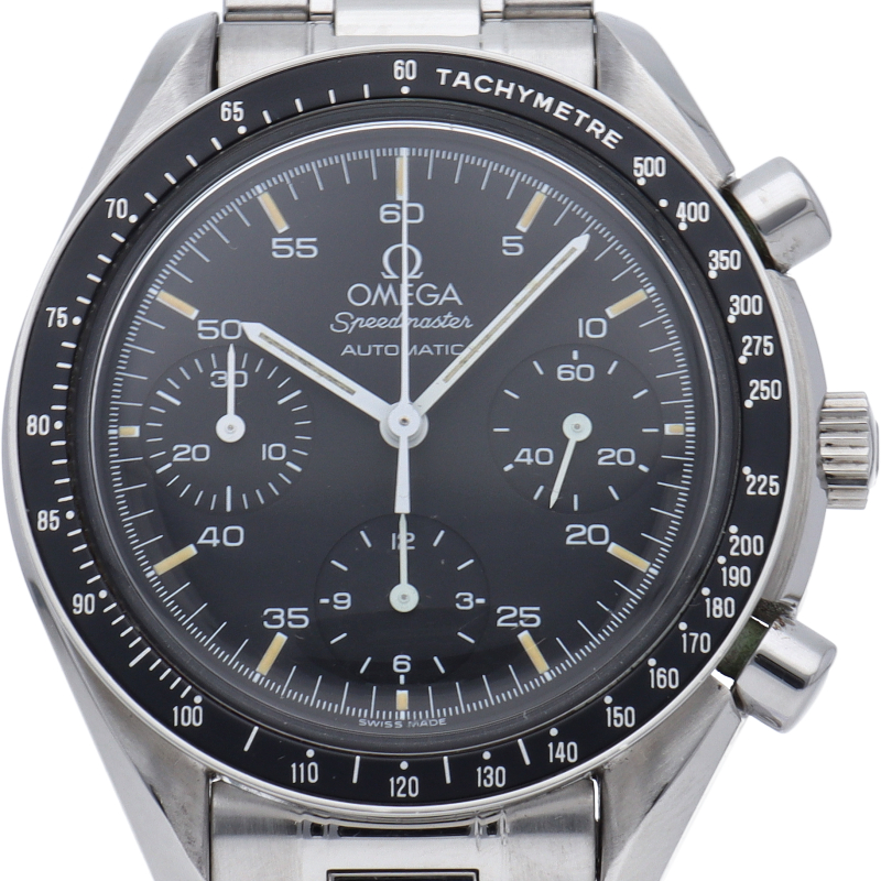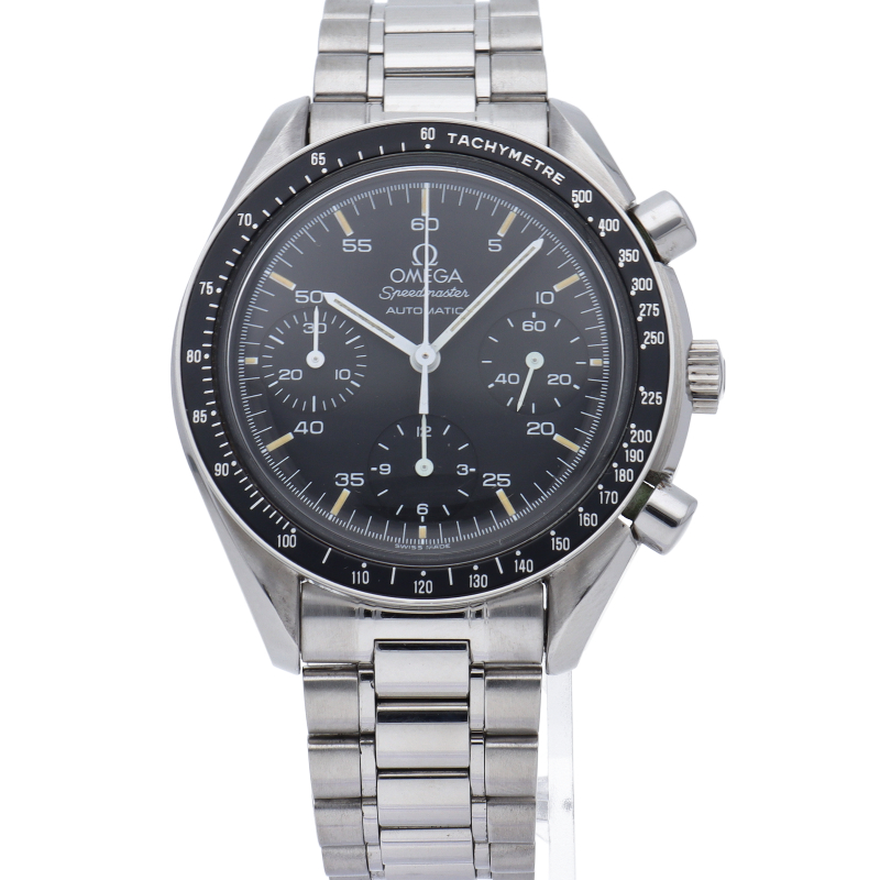 オメガを代表する人気シリーズ「スピードマスター」。プラ風防を使用したレトロな雰囲気かつシンプルにまとまったデザインがスタイルを選ばずにご使用いただけます。