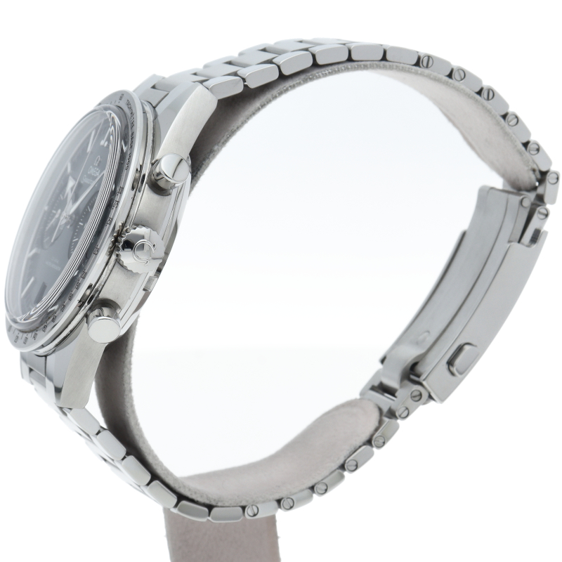 伝説的な1957年の初代スピードマスターにインスピレーションを受けたこのモデルは、ステンレススティール製ケースとブラックのダイアル、ヴィンテージ スーパールミノヴァが塗布された凹型のインデックスを備えています。ロジウム仕上げの「ブロードアロー」針、6時位置に日付表示、9時位置にスモールセコンド、3時位置には12時間と60分の同軸積算計のサブダイアルが配置されています。