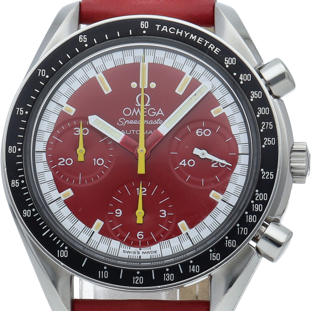 数々のF1チャンピオンに輝いたシューマッハとオメガのコラボレーション「スピードマスター」。シンプルな中にもひときわ目立つ文字盤の配色がオシャレな1本。