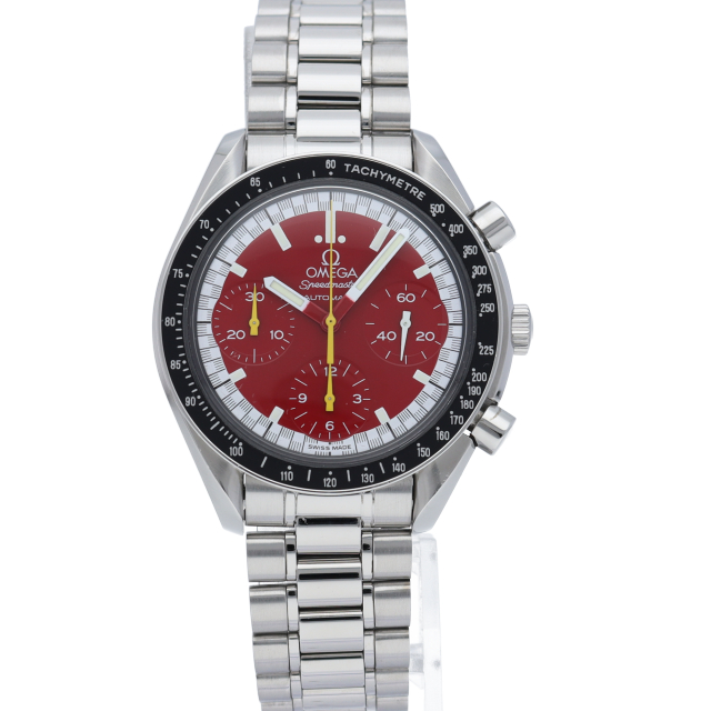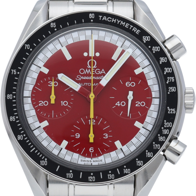数々のF1チャンピオンに輝いたシューマッハとオメガのコラボレーション「スピードマスター」。シンプルな中にもひときわ目立つ文字盤の配色がオシャレな1本。