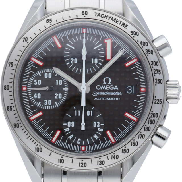 モータースポーツをイメージして設計された「スピードマスター レーシング」。伝説のドライバー、ミハエル・シューマッハが2001年ワールドチャンピオンになったのを記念に作られた世界限定11111本限定モデル。インデックスの1の数字と限定本数11111本という、「NO.1」にこだわり抜いた貴重な1本。