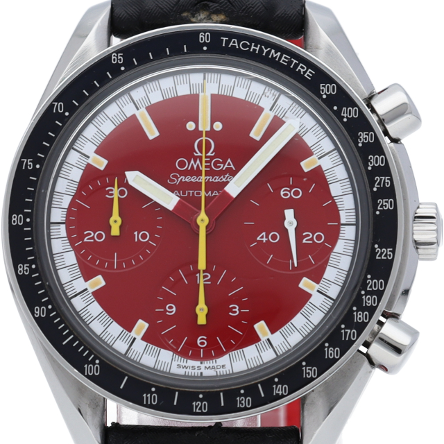 数々のF1チャンピオンに輝いたシューマッハとオメガのコラボレーション「スピードマスター」。シンプルな中にもひときわ目立つ文字盤の配色がオシャレな1本。