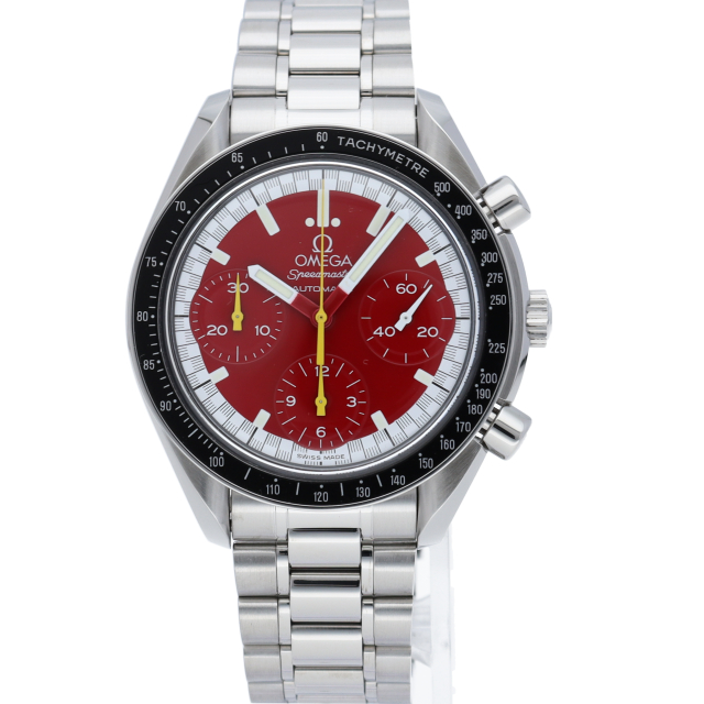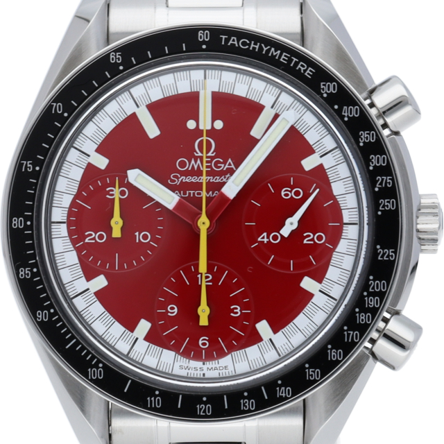 数々のF1チャンピオンに輝いたシューマッハとオメガのコラボレーション「スピードマスター」。シンプルな中にもひときわ目立つ文字盤の配色がオシャレな1本。
